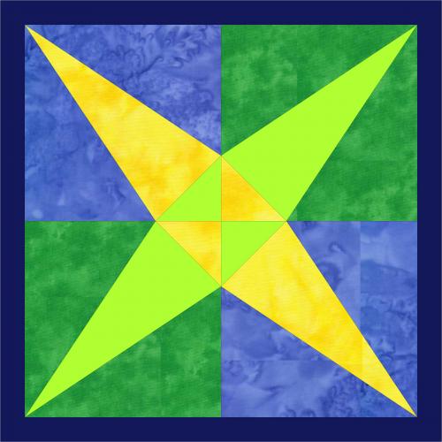 The quilt block, "Crossed Canoes", reflects the colours of the grass, the lake and the sunshine, and represents the importance of the waterway of our Port.