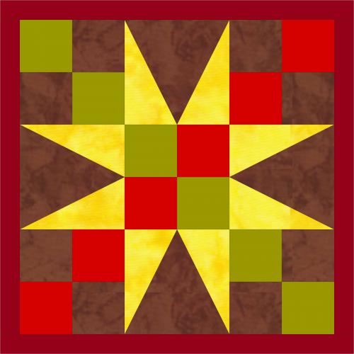 The quilt block, “Garden Patch”, is illustrative of the market gardening at this location with the colours of green and red for his specific crops of peppers and strawberries, brown for the rich soil and the yellow star for the sunlight which is not only growing the crop but supplying energy.
